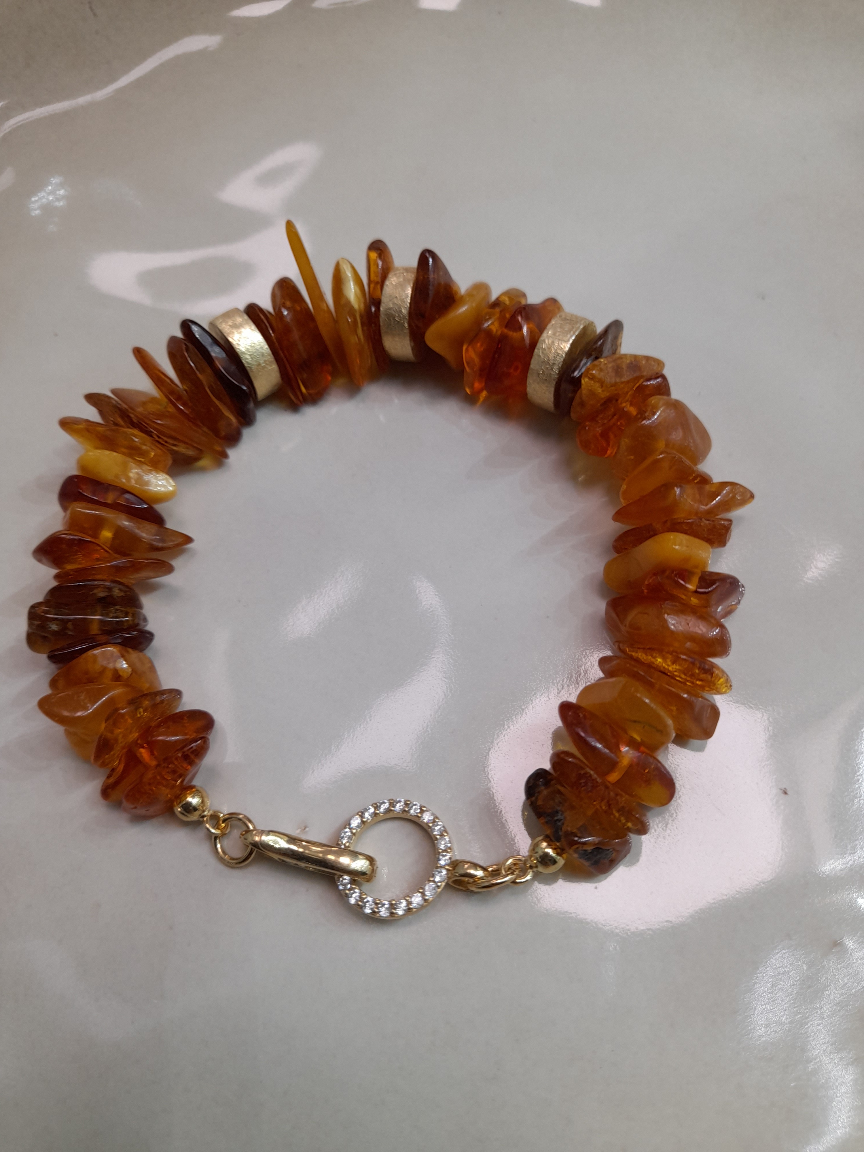 Bransoletka wykonana jest ręcznie z połączenia srebra pozłacanego oraz bursztynów. Długość bransoletki to ok. 17 - 20 cm.