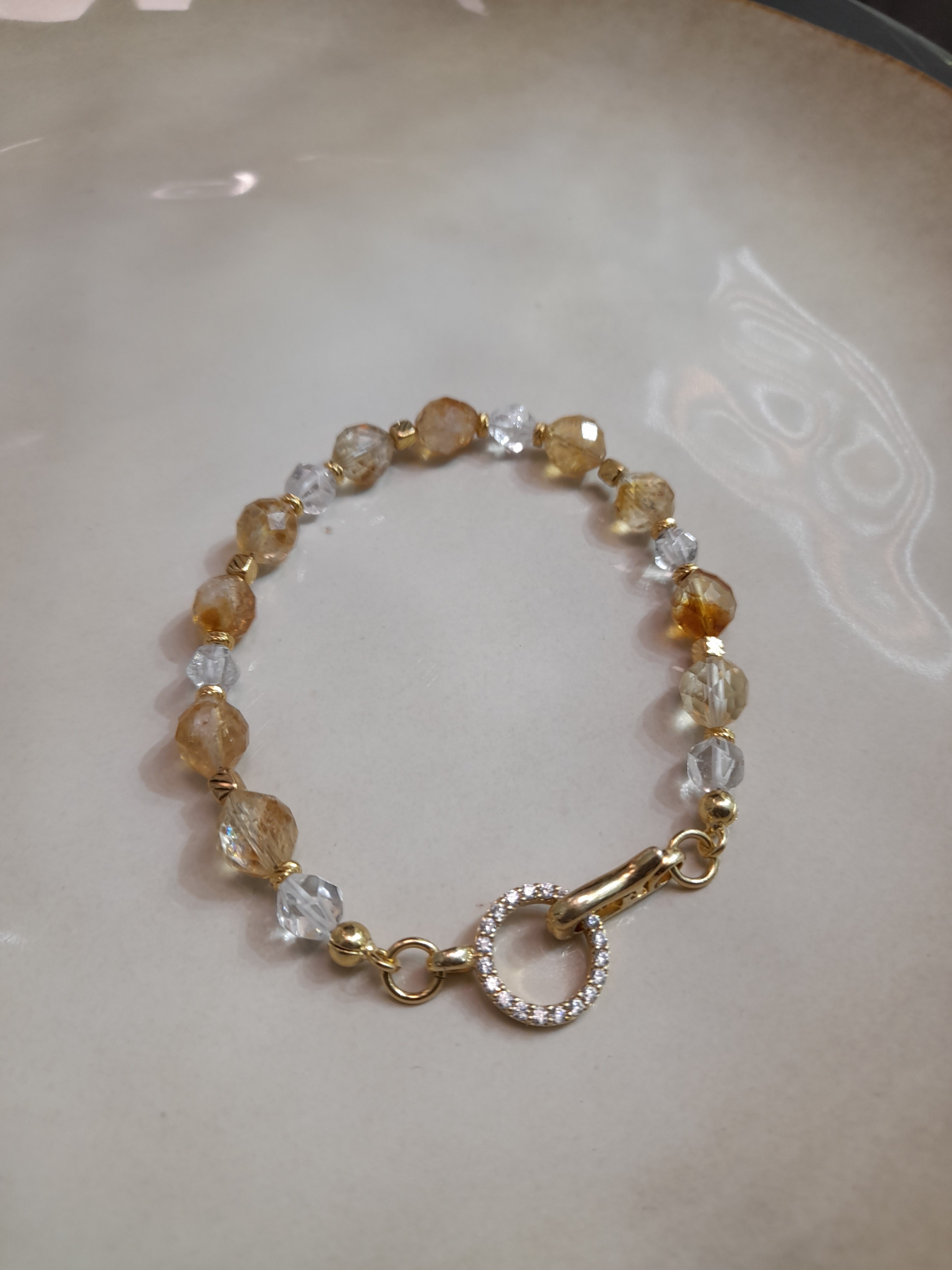 Bransoletka wykonana jest ręcznie z połączenia srebra pozłacanego oraz kryształów górskich i cytrynów. Długość bransoletki to ok. 17 - 20 cm.