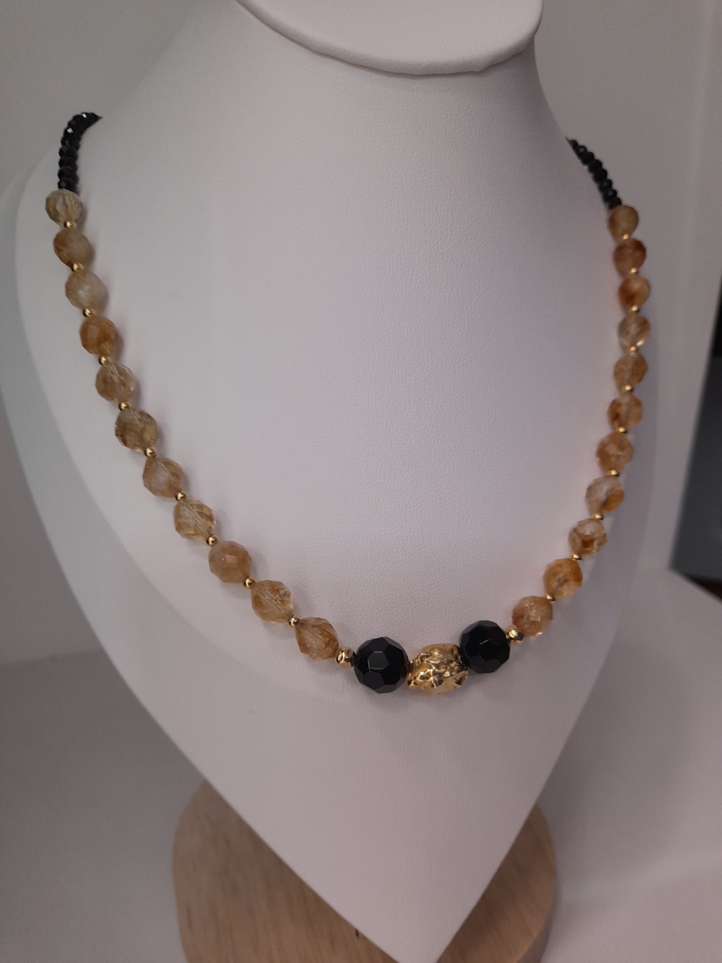 Naszyjnik wykonany jest ręcznie z połączenia srebra pozłacanego, cytrynów oraz turmalinów. Długość naszyjnika to ok. 45 - 50 cm.