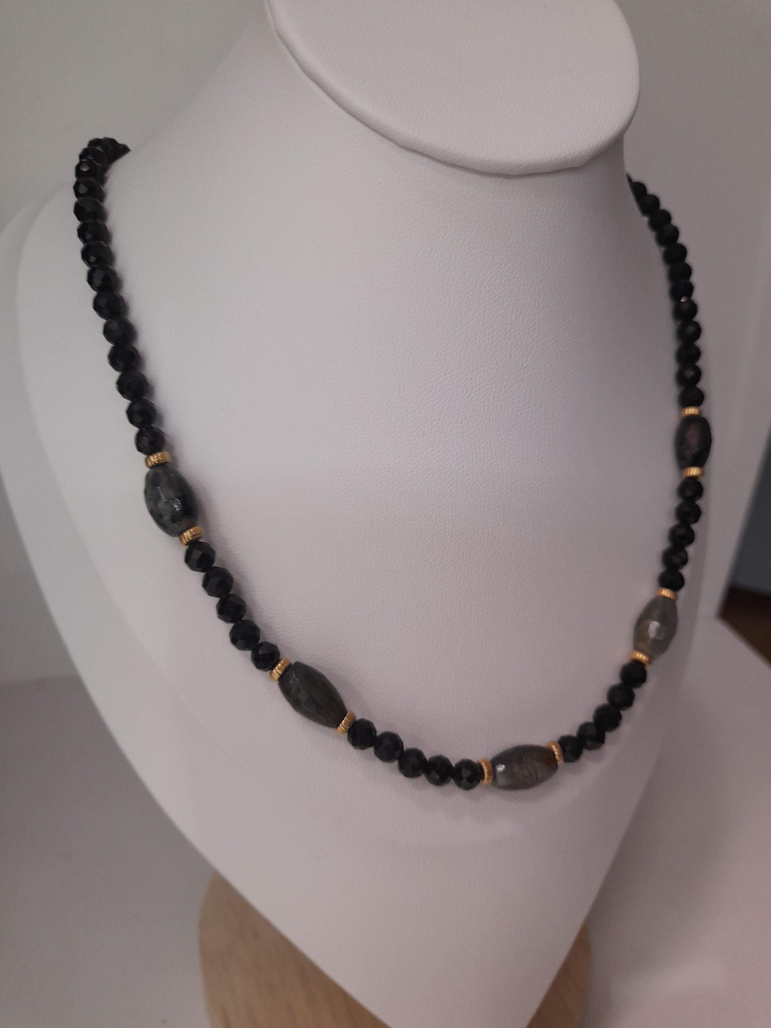 Naszyjnik wykonany jest ręcznie z połączenia srebra pozłacanego, agatów oraz turmalinów. Długość naszyjnika to ok. 45 - 50 cm.