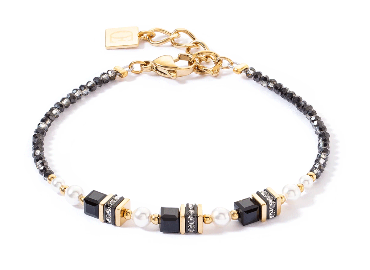 Bransoletka wykonana jest z kamieni naturalnych, szkła i kryształów. Zapięcie wykonane jest ze stali szlachetnej w kolorze żółtego złota. Jej długość to 18cm + 3 cm przedłużka.
