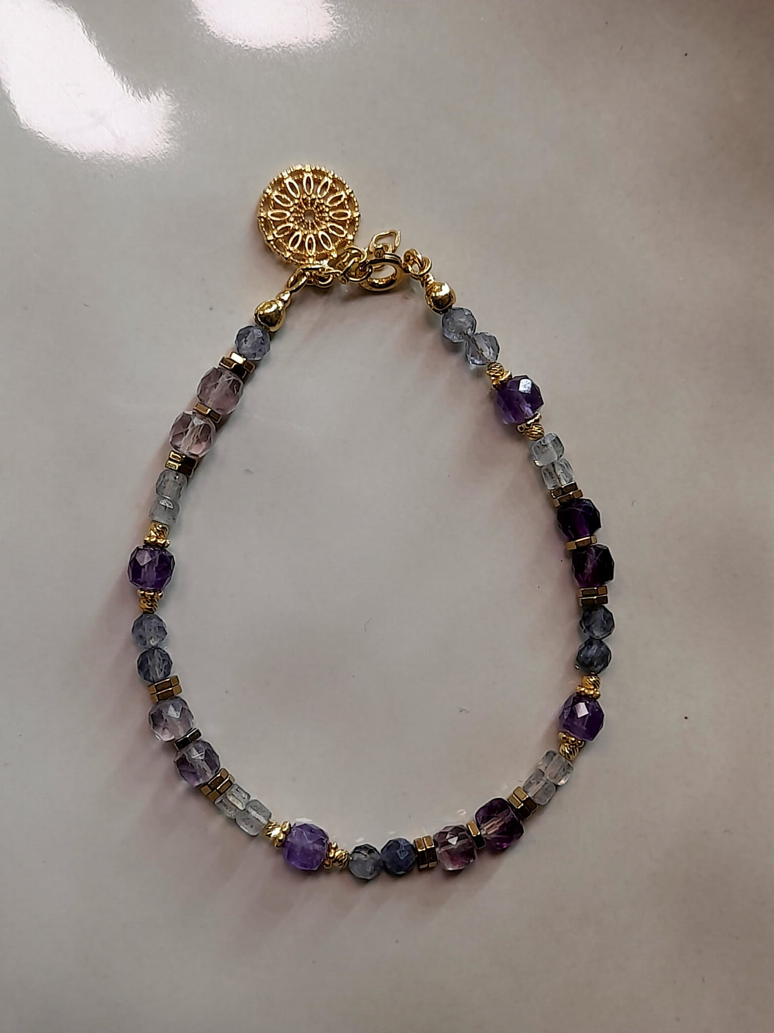 Bransoletka wykonana jest ręcznie z połączenia srebra pozłacanego 24 karatowym złotem oraz ametystów i fluorytów.