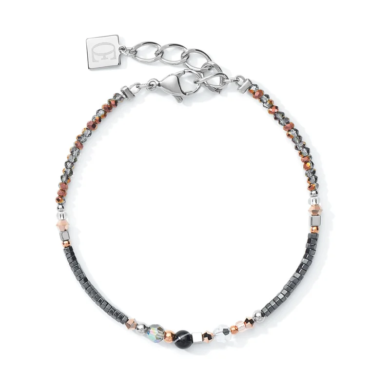 Bransoletka wykonana jest z kamieni naturalnych takich jak hematyt, onyks, szkła oraz kryształów. Zapięcie wykonane jest ze stali szlachetnej w kolorze srebra. Jej długość to 17,5 cm + 3 cm przedłużka.