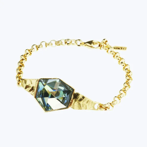 Bransoletka z kolekcji Aurora jest wykonana ręcznie ze srebra pozłacanego próby 925. Wykończenie srebra to królewskie złoto 24K. Wielkość kamienia wynosi 2 cm na 2cm. Kryształ jest w kolorze Crystal Sahara.