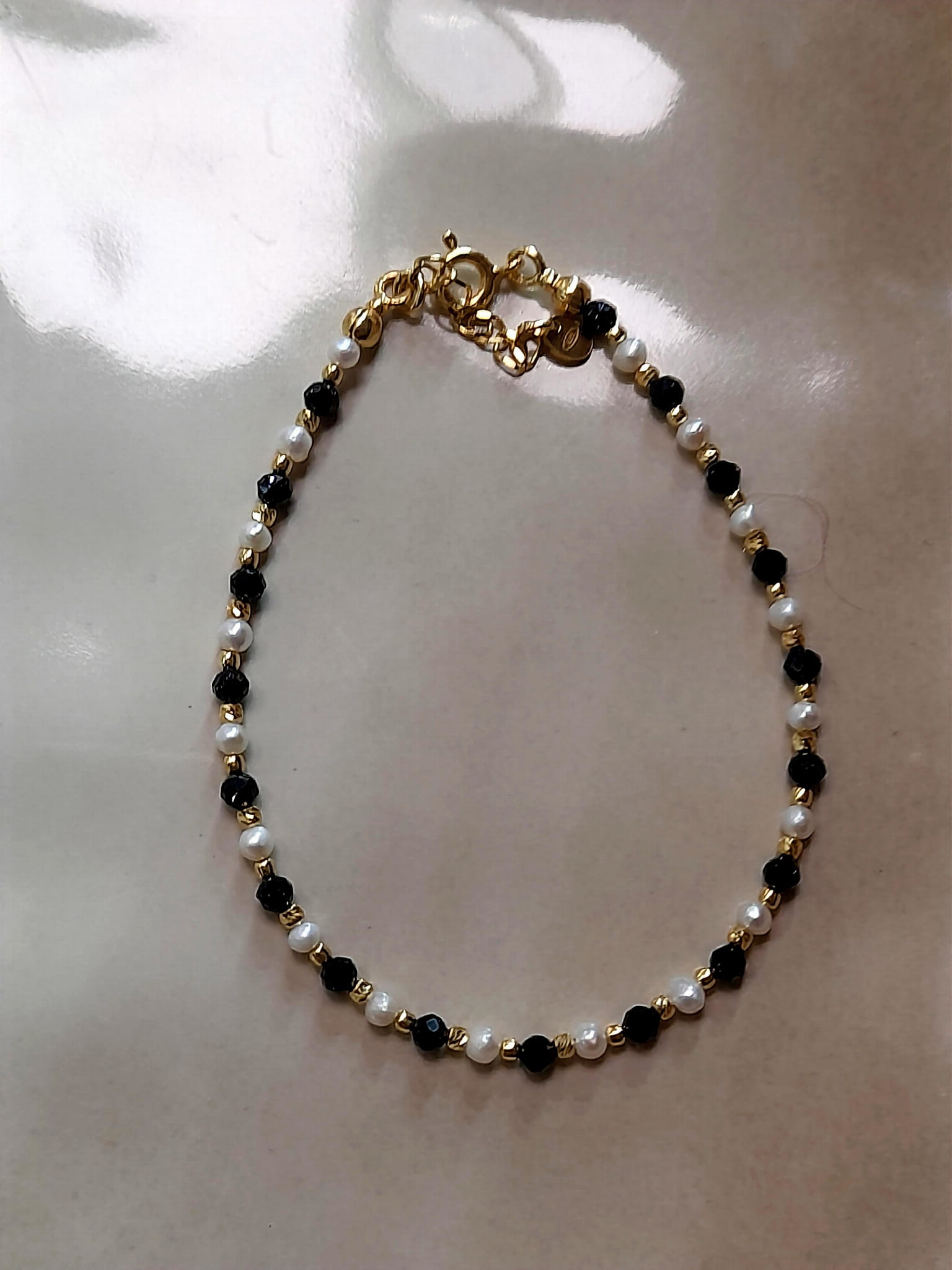 Bransoletka wykonana jest ręcznie z połączenia srebra pozłacanego 24 karatowym złotem oraz nocy kairu i pereł.