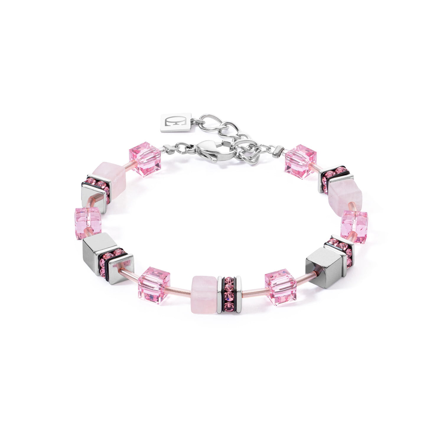 Bransoletka wykonana jest z kamieni takich jak kwarc różowy, hematyt, kryształ górski. Zdobią ją również elementy ze szkła i kryształów. Stal szlachetna jest w kolorze srebra. Jego długość to 18,5 cm + 3 cm przedłużka.