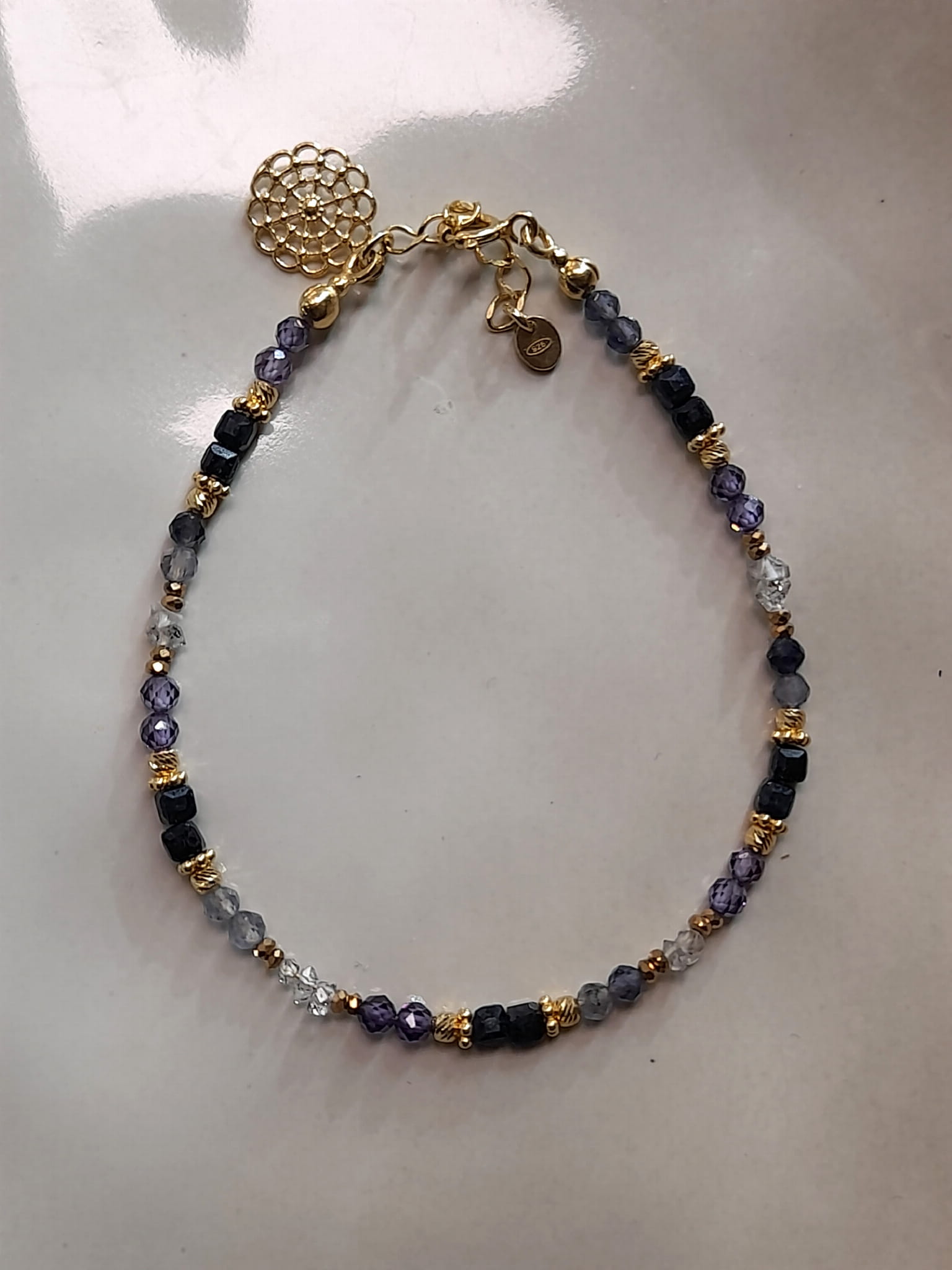 Bransoletka wykonana jest ręcznie z połączenia srebra pozłacanego 24 karatowym złotem oraz topazów, ametystów i kryształów górskich.