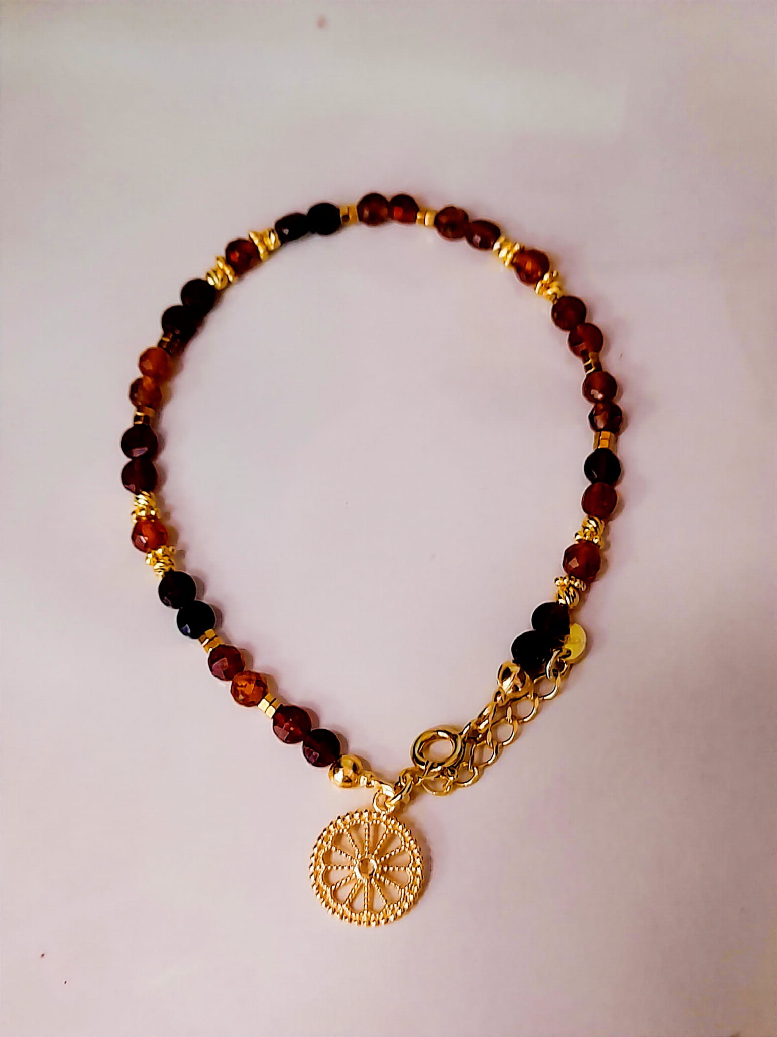 Bransoletka wykonana jest ręcznie z połączenia srebra pozłacanego 24 karatowym złotem oraz granatów.