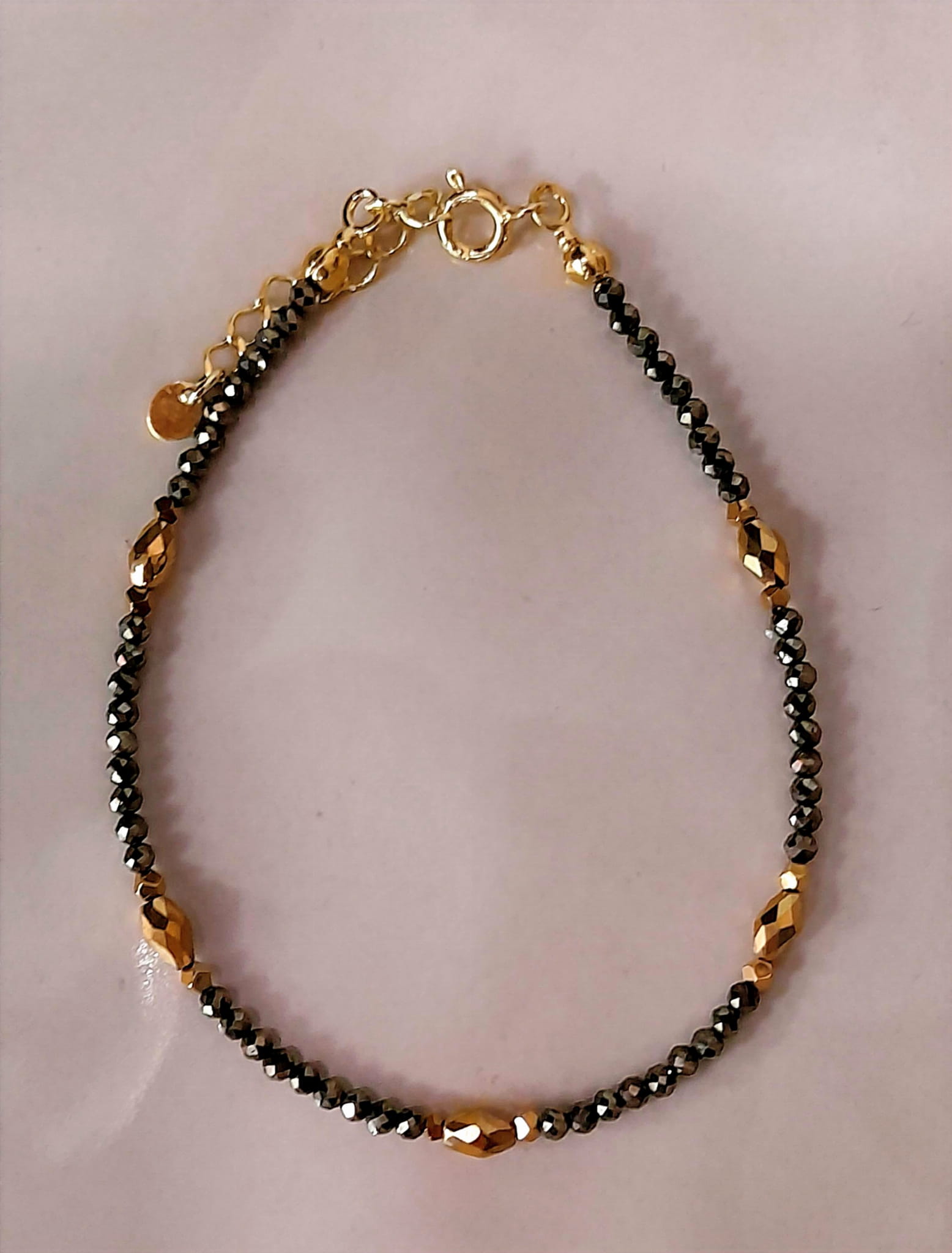 Bransoletka wykonana jest ręcznie z połączenia srebra pozłacanego 24 karatowym złotem oraz pirytów.