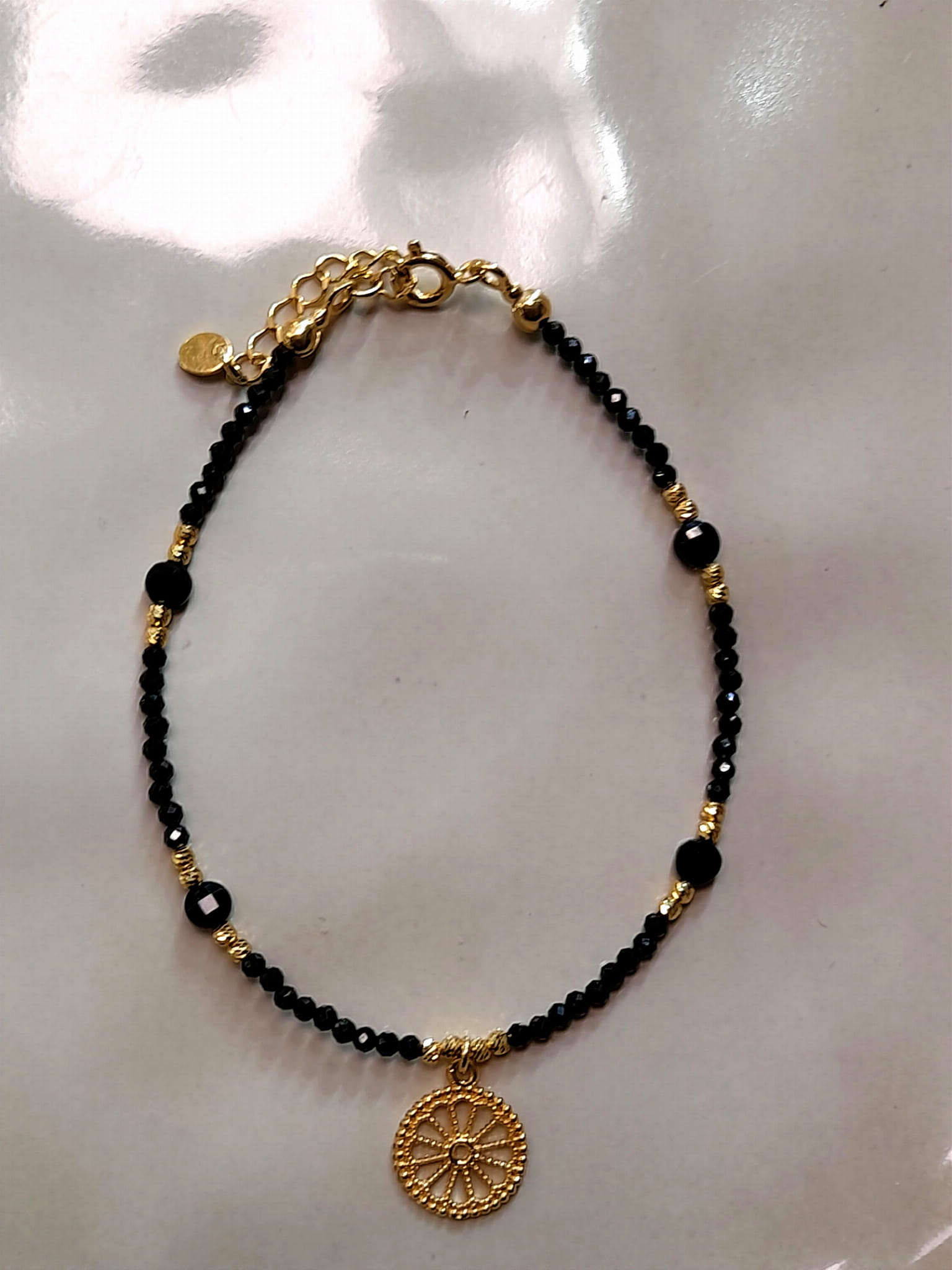 Bransoletka wykonana jest ręcznie z połączenia srebra pozłacanego 24 karatowym złotem oraz turmalinów.