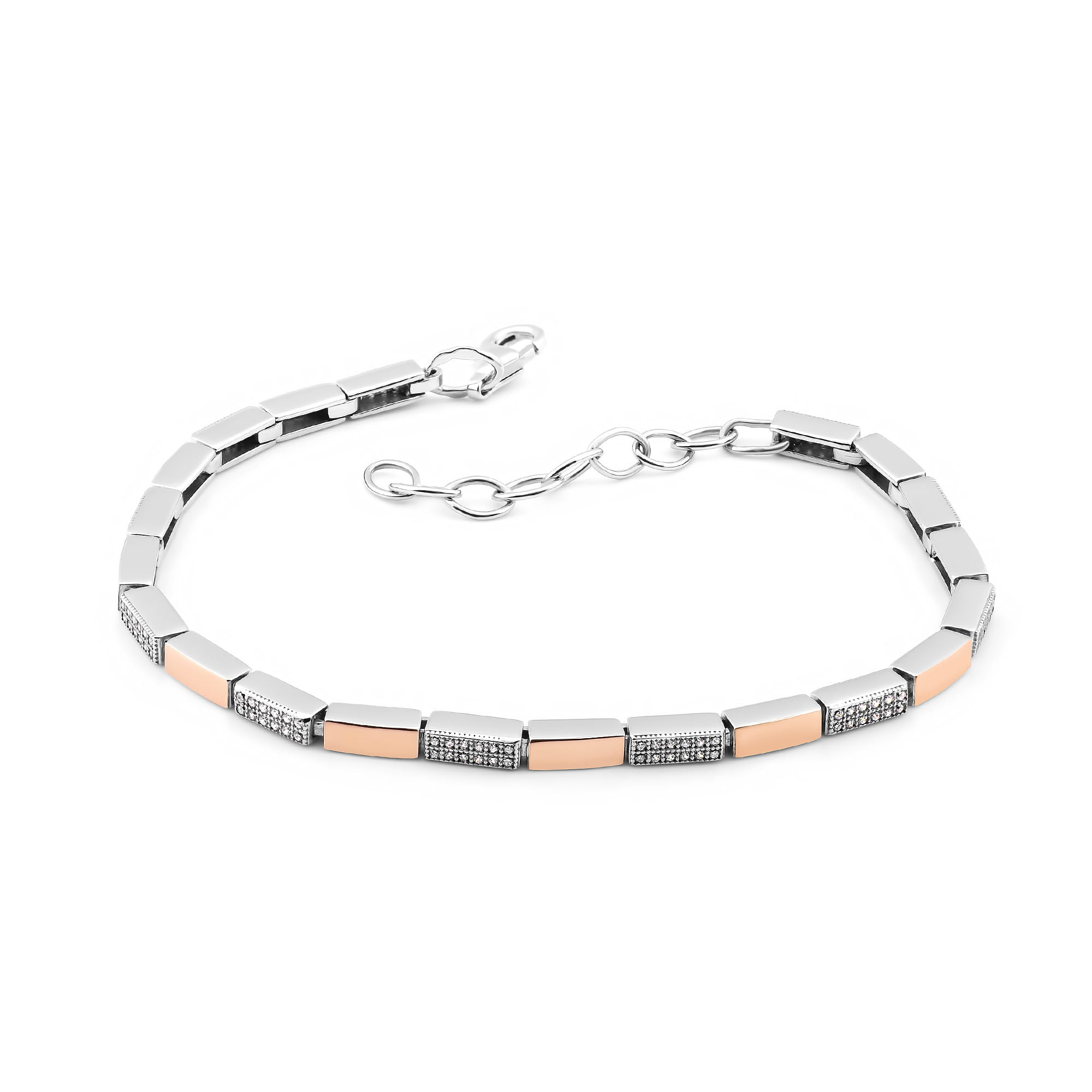 Bransoletka jest wykonana ze srebra rodowanego, płytki złota w próbie 375 oraz cyrkonii.