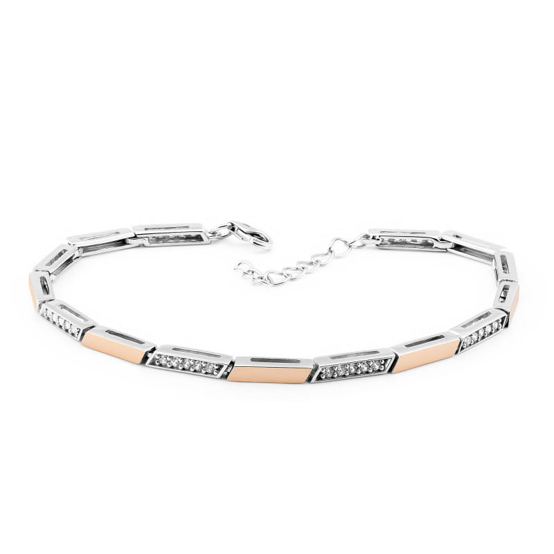 Bransoletka wykonana jest ze srebra rodowanego, płytki złota w próbie 375 oraz białych cyrkonii.