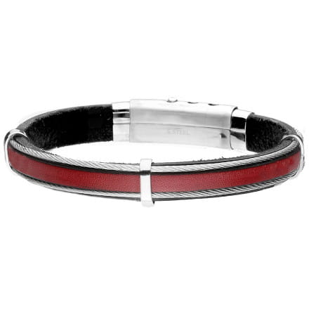 Oryginalna i elegancka męska bransoleta wykonana ze skóry naturalnej oraz hipoalergicznej stali szlachetnej. Model wyposażony jest w wygodne zapinanie, które umożliwia dopasowanie długości do obwodu nadgarstka. Bransoletkę ozdobiono dwiema, stalowymi linkami oraz czerwonym skórzanym paskiem.