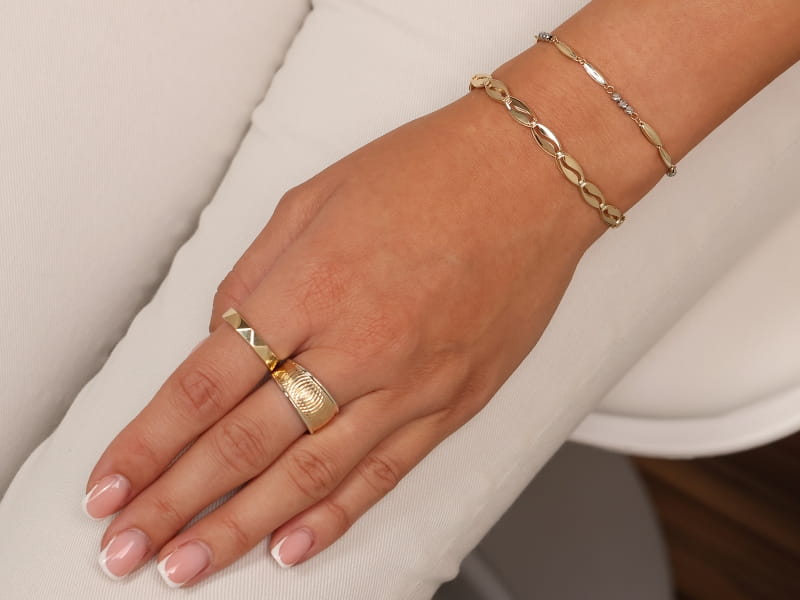 Bransoletki płaskie, gładkie złoto doskonale sprawdzą się jako ozdobado codziennej stylizacji.
