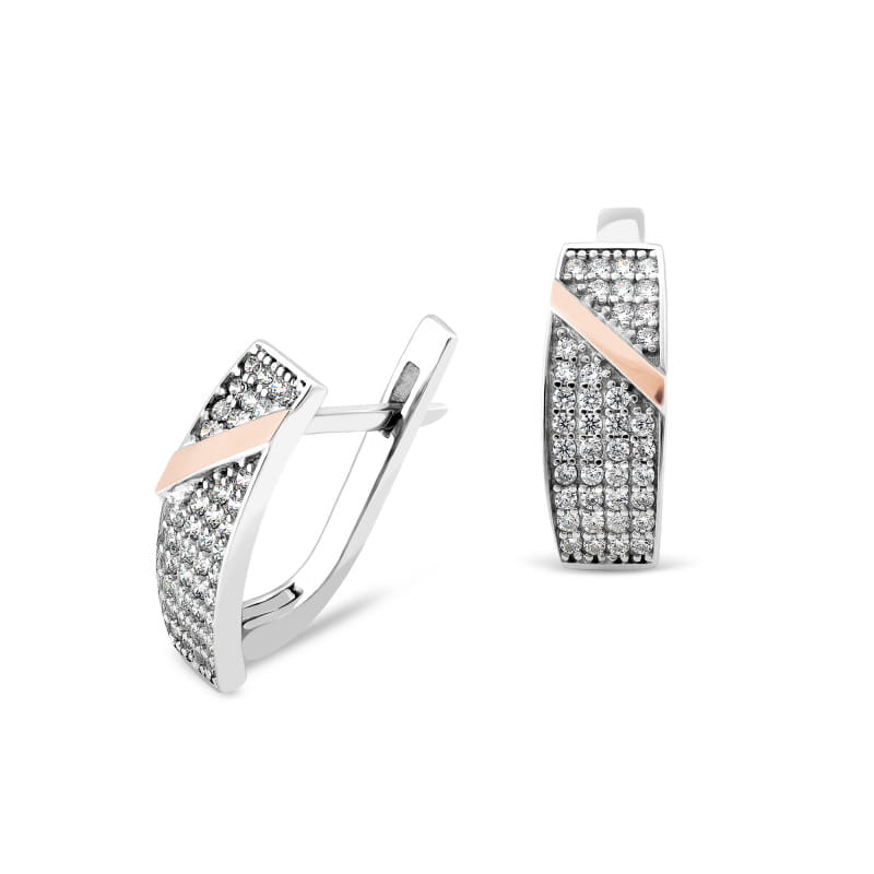Kolczyki są wykonane ze srebra rodowanego, płytki złota w próbie 375 oraz białych cyrkonii.