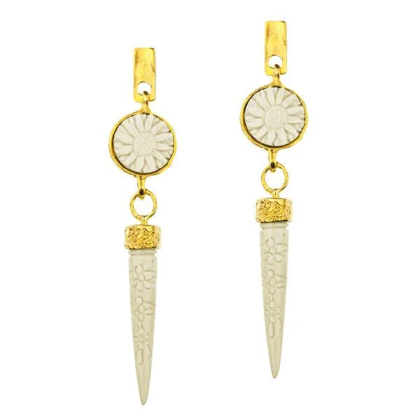 Kolczyki z kolekcji Biały Łabędź są wykonane ręcznie ze srebra pozłacanego próby 925. Ozdobne elementy z poroża jelenia mają wymiary: – okrągły jest o średnicy 2,5 cm oraz podłużny jest o długości 3,5 cm. Całkowita długość kolczyków wynosi 8,5 cm, a zapięcie jest w formie sztyftu.