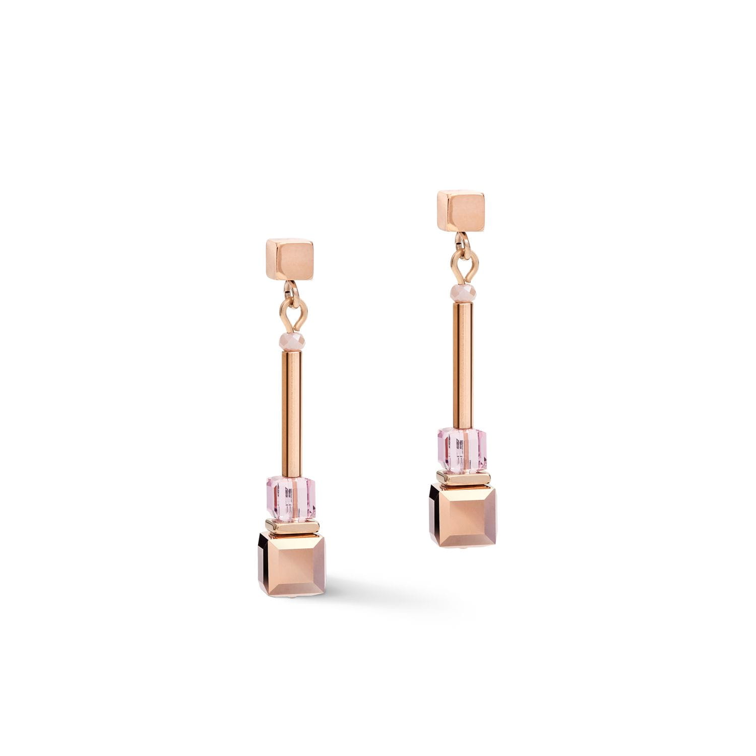 Kolczyki wykonane są z fasetowanego szkła, kryształów oraz stali szlachetnej 316L w kolorze różowego złota.