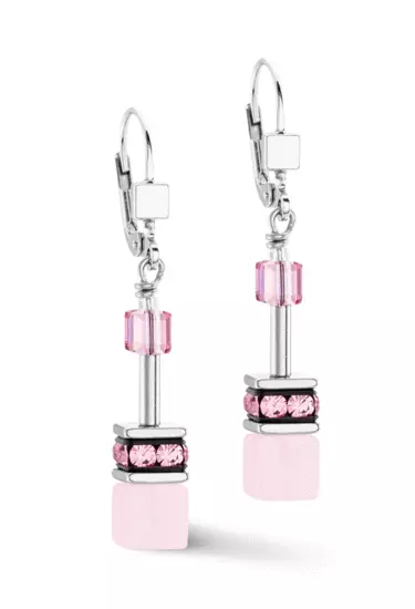 Kolczyki wykonane są z kamieni naturalnych takich jak różowy kwarc, kryształów, szkła i stali szlachetnej w srebrnym kolorze. Zapięcie kolczyka to bigiel klasyczny. Długość kolczyków to 4 cm.