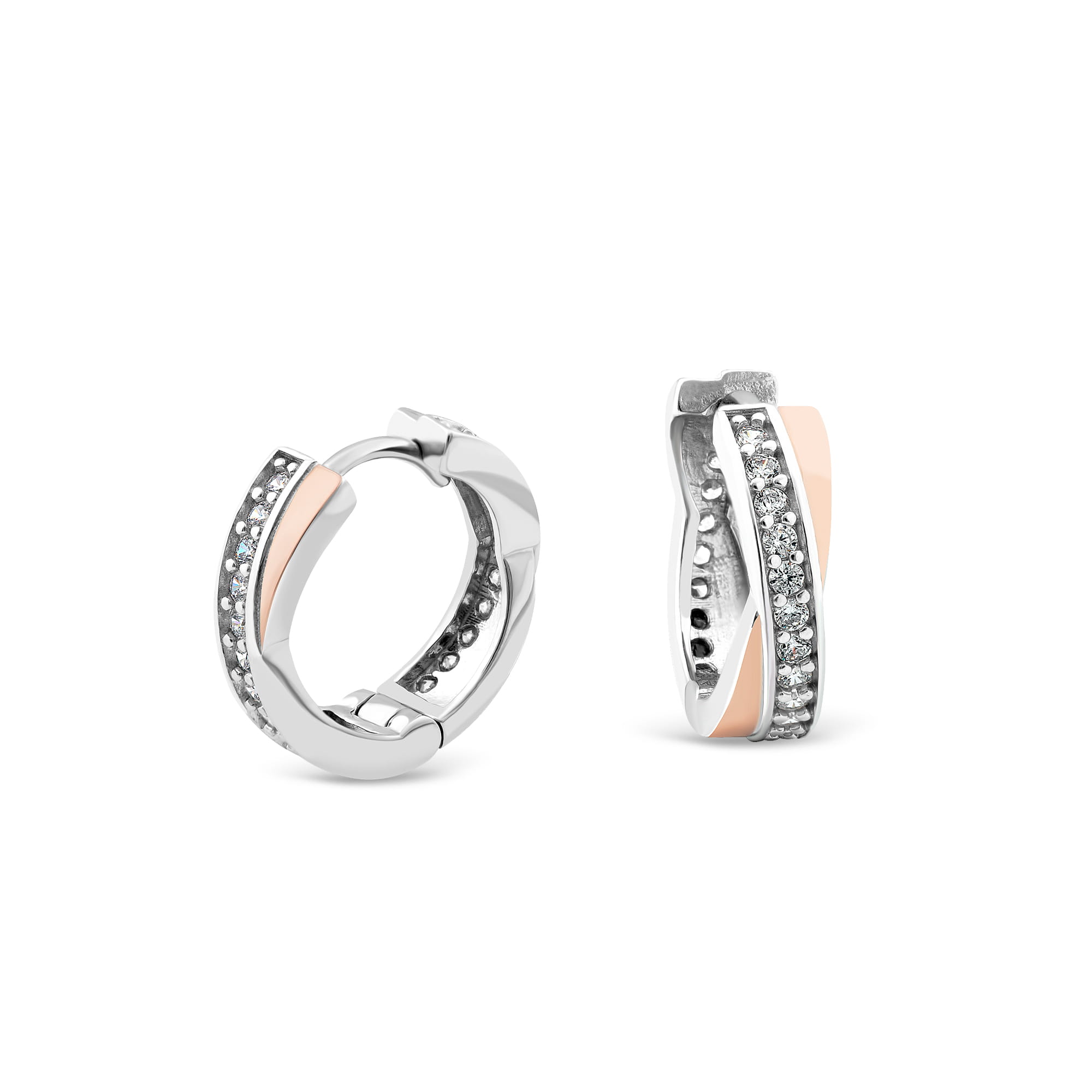 W kolczykach występuje motyw cyrkonii ułożonych w dwóch liniach połączonych ze złotymi wstawkami.