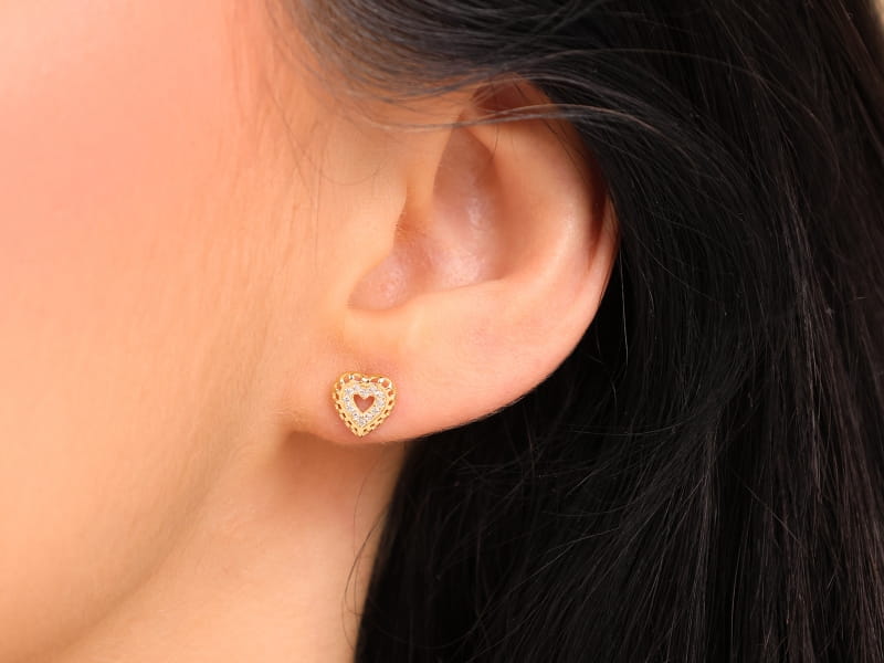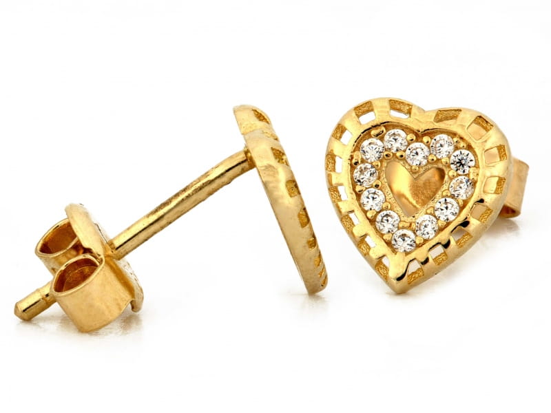 Kolczyki złote na sztyfcie serca z cyrkonimi