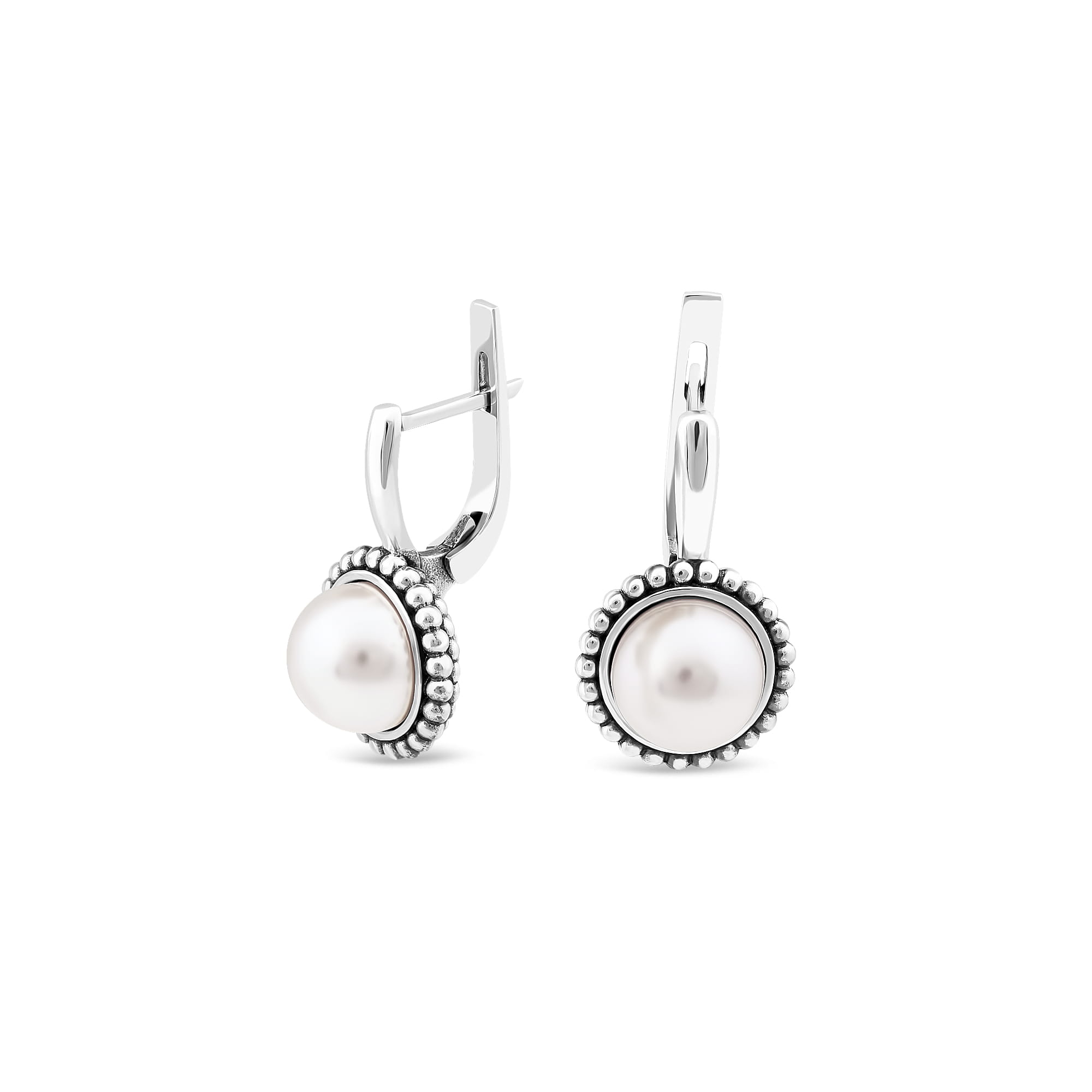 Kolczyki wykonane ze srebra rodowanego ozdabiane perłą naturalną.