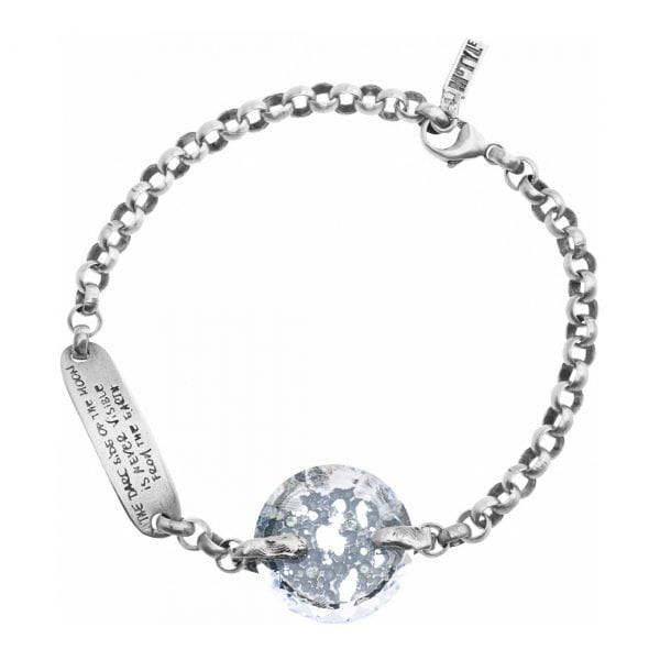 Bransoletka z kolekcji Cosmic Love ze srebra oksydowanego próby 925 wykonana jest ręcznie. Wykończenie srebra to „antyczne srebro”. Kryształ Swarovskiego jest w kolorze Crystal. Średnica zawieszki wynosi 2cm, a długość bransoletki wynosi max. 21cm.