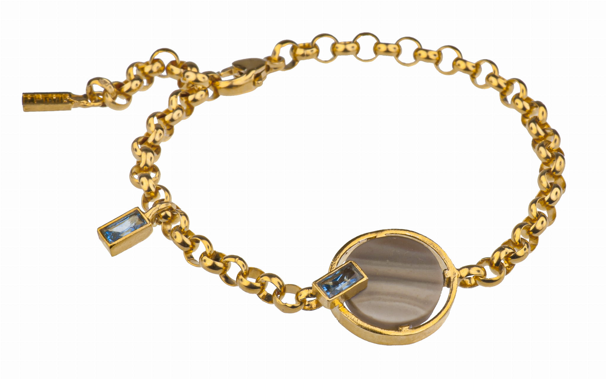 Bransoletka z kolekcji Diuna wykonana ręcznie ze srebra próby 925, natomiast złocenie wykonano "królewskim złotem 24K”. Kamień naturalny to krzemień pasiasty o średnicy 1,4 cm. Nanokryształy w kolorze Aquamarine o wymiarach 3 x 6 mm. Bransoletka posiada możliwość pełnej regulacji.