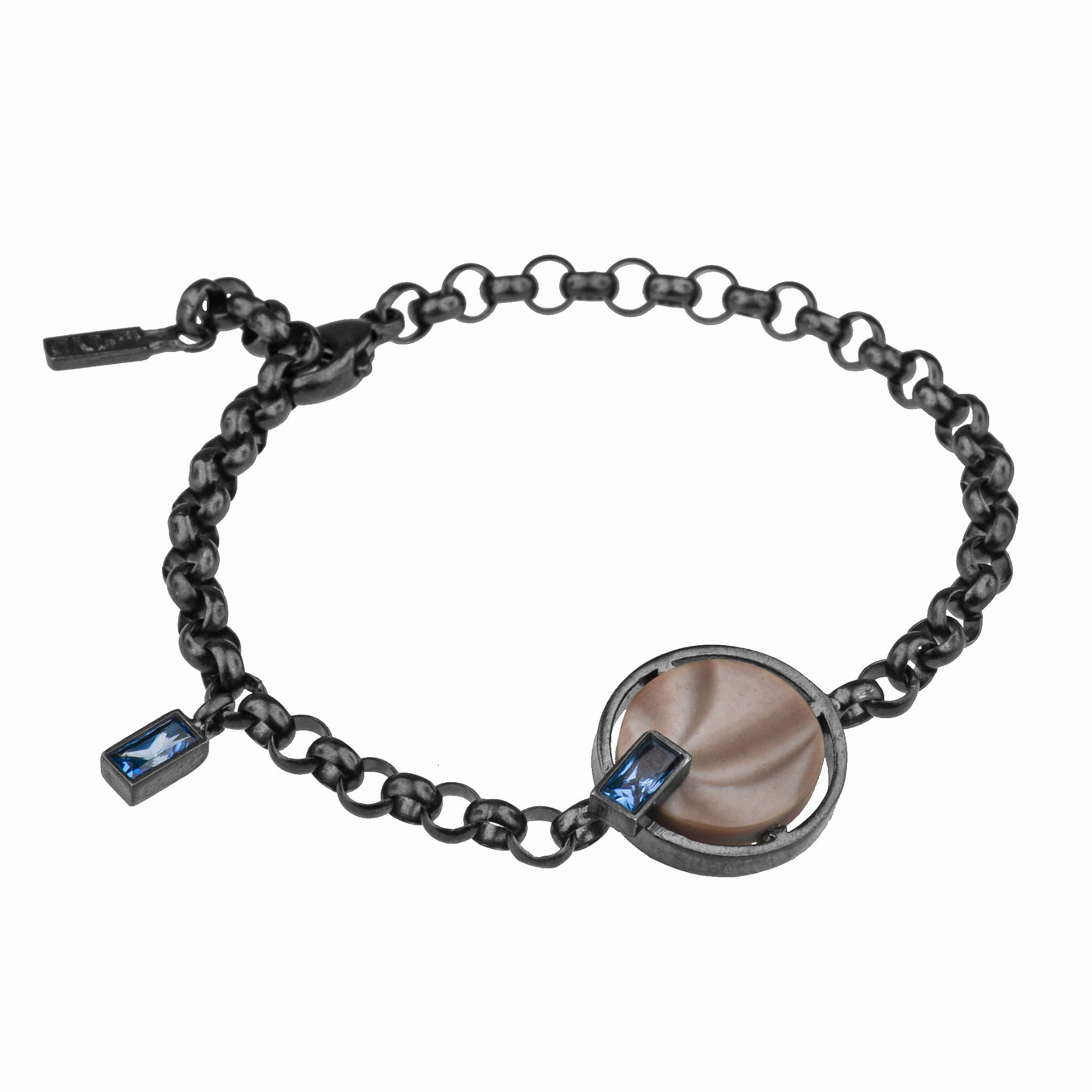 Bransoletka z kolekcji Diuna wykonana jest ręcznie ze srebra rodowanego próby 925. Wykończenie srebra to „24K grafitowy blask”. Kamień naturalny to krzemień pasiasty o średnicy 1,4 cm. Nanokryształy w kolorze Aquamarine o wymiarach 3 x 6 mm. Bransoletka posiada możliwość pełnej regulacji.