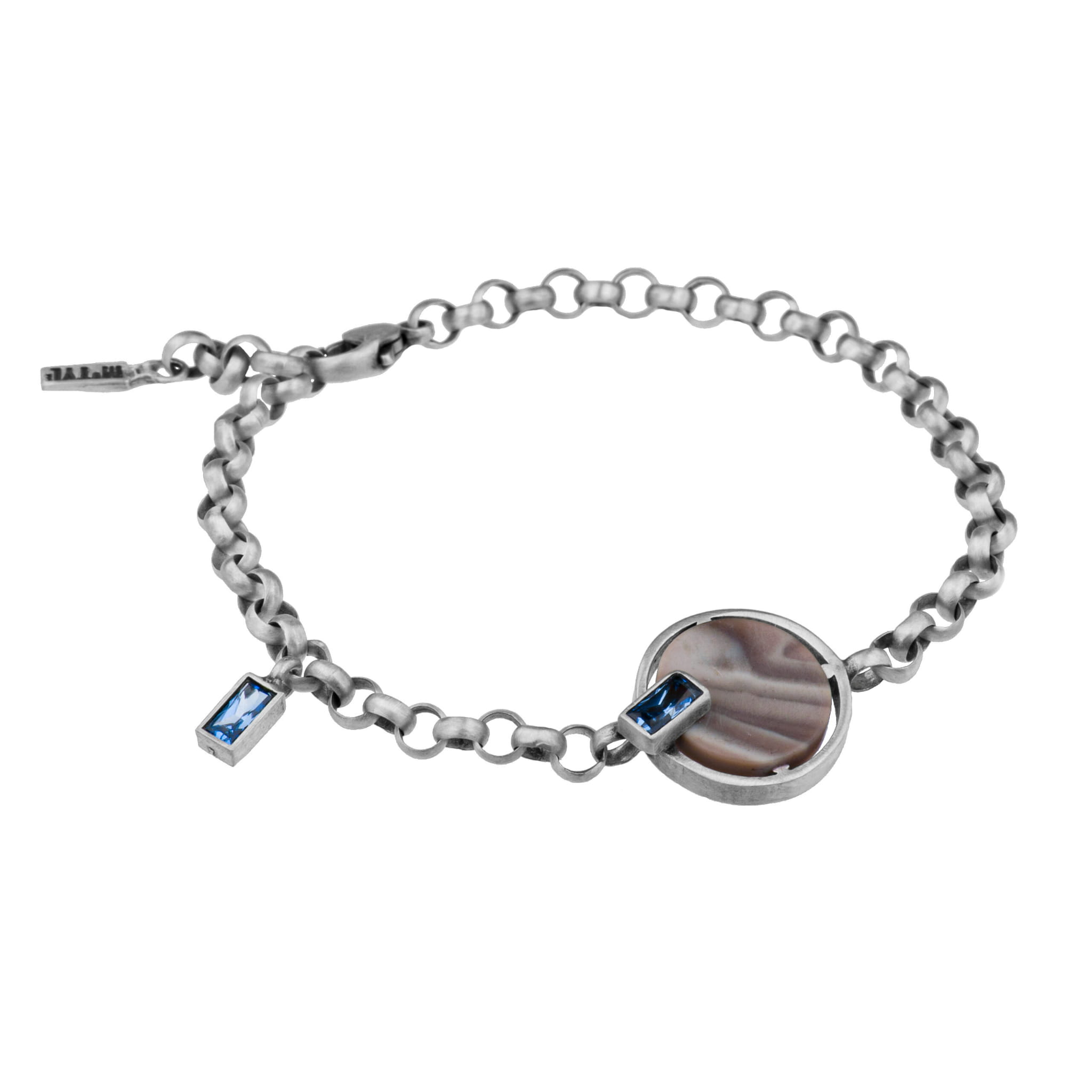 Bransoletka z kolekcji Diuna wykonana ręcznie ze srebra oksydowanego próby 925. Wykończenie srebra to „antyczne srebro”. Kamień naturalny to krzemień pasiasty o średnicy 1,4 cm. Nanokryształ jest w kolorze Aquamarine o wymiarach 3 x 6 mm. Bransoletka posiada możliwość pełnej regulacji.