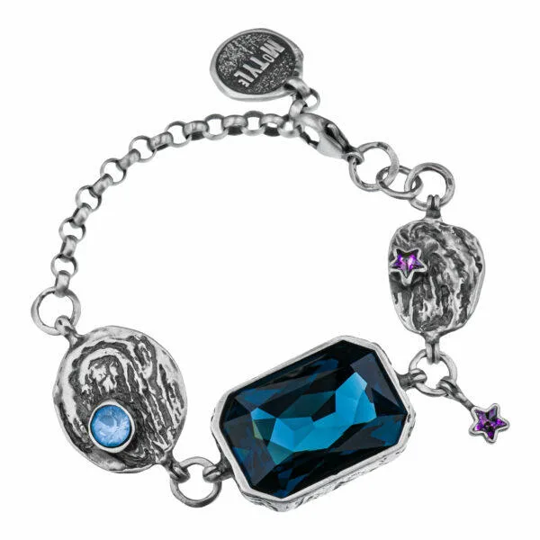 Bransoletka ze srebra – rodowanego próby 925, wykonana jest ręcznie. Wykończenie srebra to 24K grafitowy blask. Kryształ Swarovskiego duży jest w kolorze Montana wymiary 3cmx2cm. Średnica kryształu Swarovskiego to gwiazdka w kolorze Vitrail Light 0,5cm. Średnica kryształu Swarovskiego to kółko w kolorze Sky Ignite 0,7cm. Długość całkowita naszyjnika wynosi 21,5 cm z możliwością regulacji na całej długości. Długość elementów ozdobnych wynosi 10,5cm. Typ zapięcia to karabińczyk.