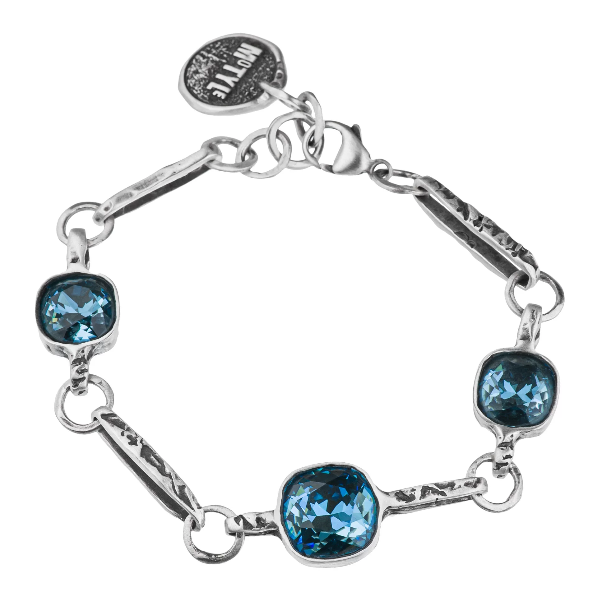 Bransoletka z kolekcji Wyspa Skarbów wykonana ręcznie ze srebra oksydowanego próby 925. Wykończenie srebra to antyczne srebro. Kamień to kryształ w kolorze Aquamarine o wymiarach: 1,3 x 1,3 cm oraz 1×1 cm. Bransoletka posiada możliwość regulacji. Typ zapięcia to karabińczyk.