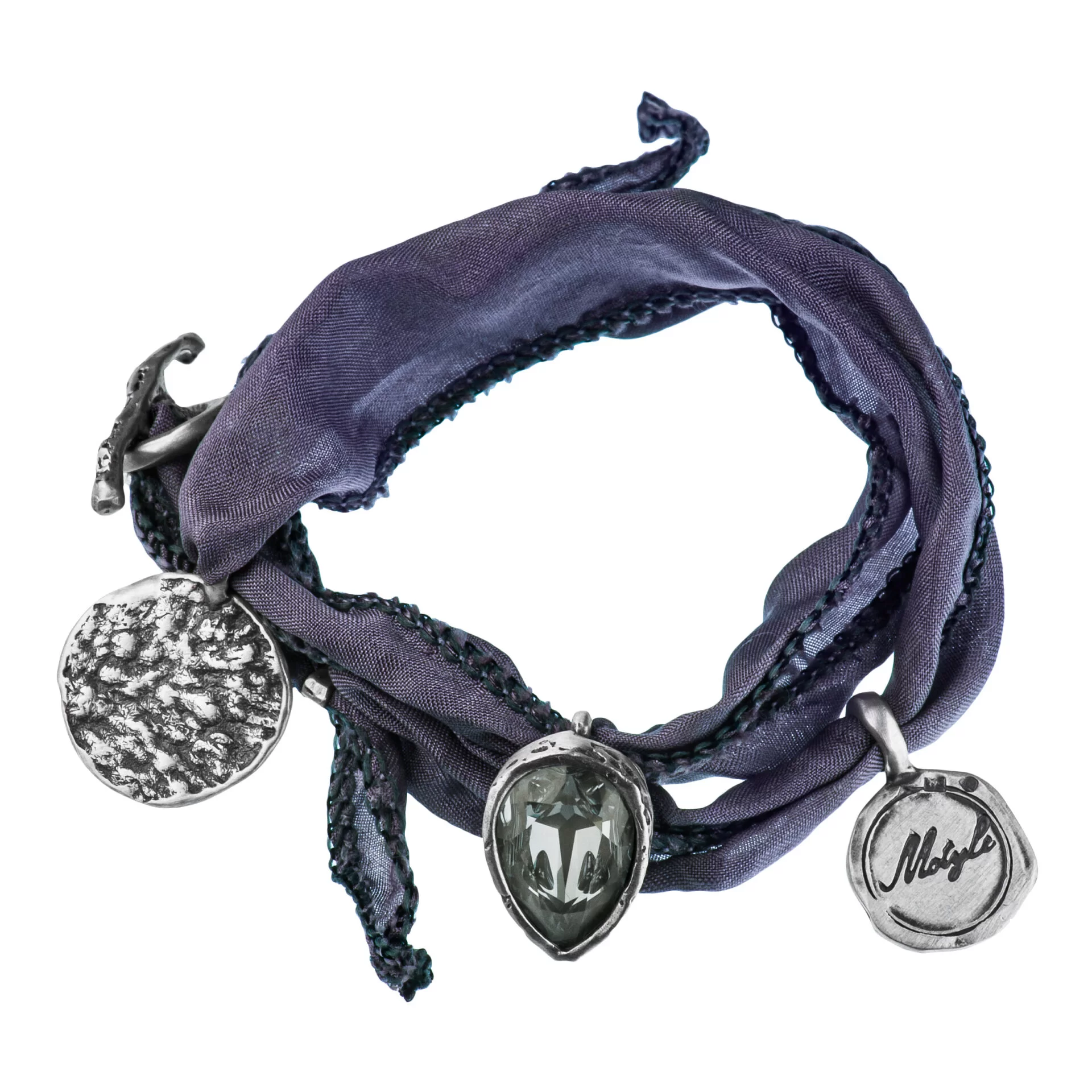 Bransoletka z kolekcji Wyspa Skarbów jest wykonana na jedwabnej szarfie z elementami srebra oksydowanego próby 925. Wykończenie srebra to antyczne srebro. Kamień to kryształ w kolorze Dark Grey.