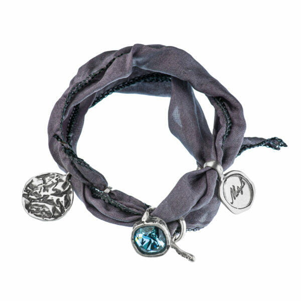 Bransoletka z kolekcji Wyspa Skarbów wykonana jest ręcznie na jedwabnej szarfie z elementami srebrnymi – oksydowanymi, próby 925. Wykończenie srebra to „antyczne srebro”. Kamień to kryształ w kolorze Aquamarine.