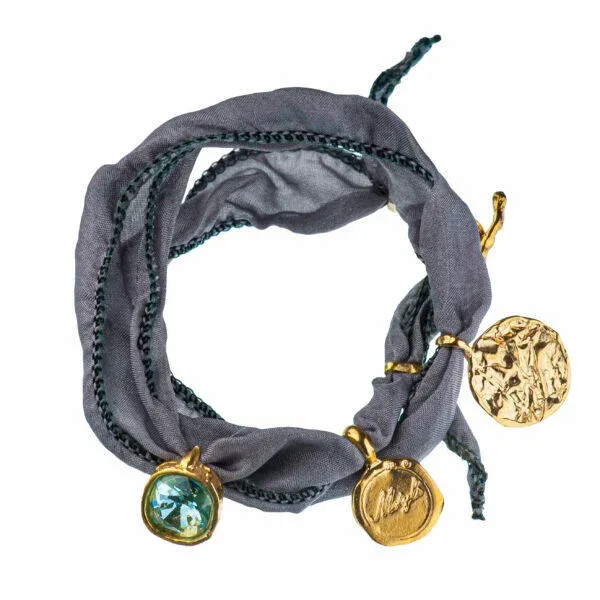 Bransoletka z kolekcji Wyspa Skarbów na jedwabnej szarfie posiada elementy srebrne - pozłacane, próby 925. Wykończenie srebra to królewskie złoto 24K. Ozdobna zawieszka jest z kryształem w kolorze Aquamarine.