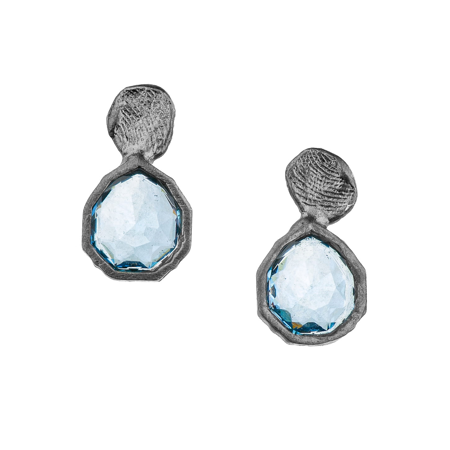 Kolczyki wykonane są ręcznie z kolekcji Botanica ze srebra rodowanego próby 925. Wykończenie srebra to “24K grafitowy blask”. Kryształ jest w kolorze Aquamarine, a jego średnica to ok. 0,7 cm. Typ zapięcia to sztyft.