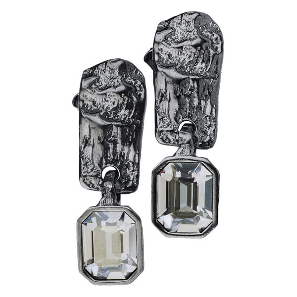 Kolekcja - Selene Kolczyki srebrne, rodowane próby 925 wykonane ręcznie. Wykończenie: czarny rod 24 k grafitowy blask. Kryształ w kolorze Crystal Silver Shade. Wielkość kolczyka wynosi ok. 3,5cm/1cm. Wielkość kryształu w kolczyku wynosi ok. 1,5cm/1cm. Każdy produkt posiada gwarancję marki w postaci srebrnego logo Motyle