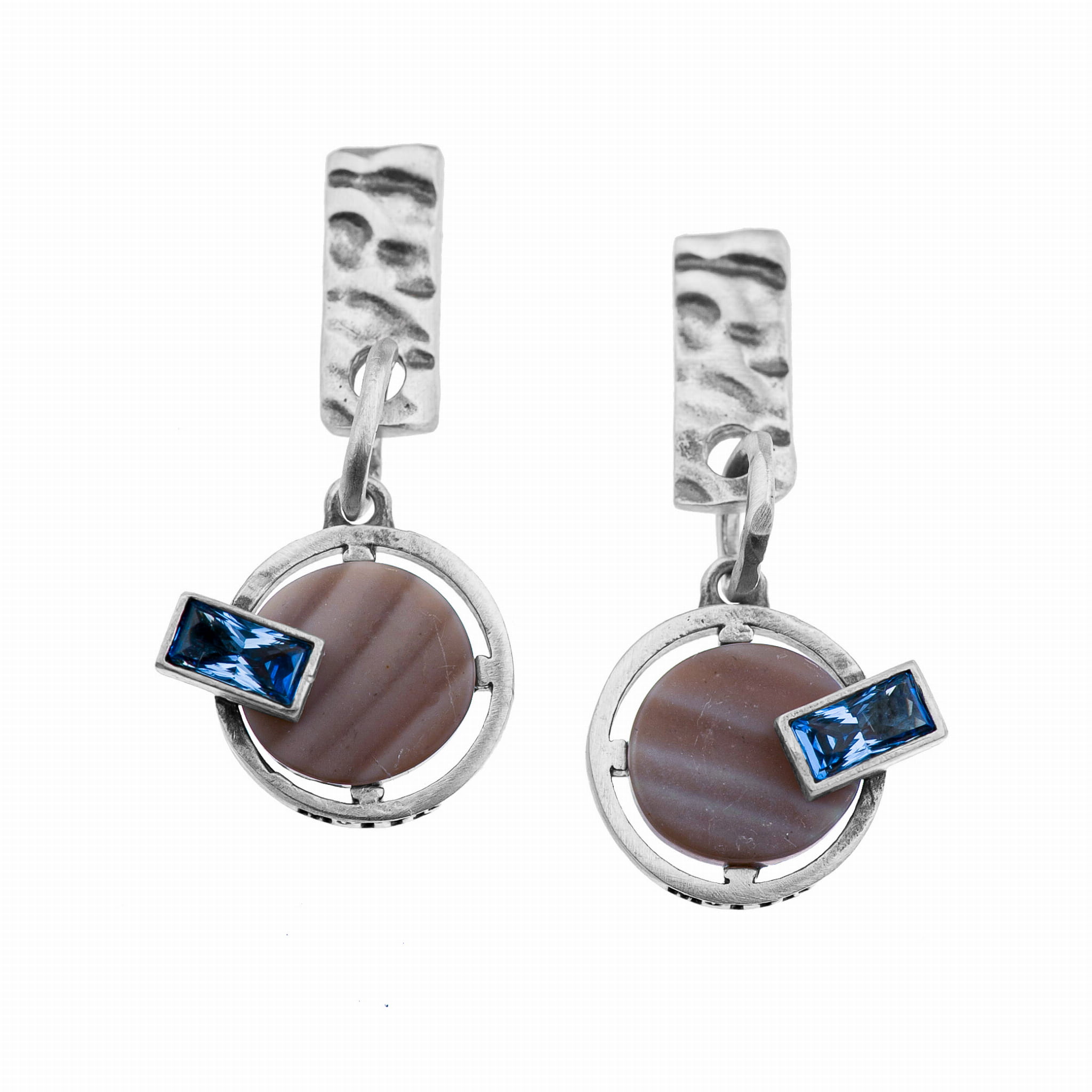 Kolczyki z kolekcji Diuna wykonane ręcznie ze srebra oksydowanego próby 925. Wykończenie srebra to „antyczne srebro”. Kamień naturalny to krzemień pasiasty o średnicy 1 cm. Nanokryształ jest w kolorze Aquamarine o wymiarach 3 x 6 mm. Długość całkowita kolczyków to ok 4 cm. Typ zapięcia to sztyft.
