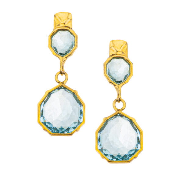 Kolczyki z kolekcji Diuna wykonane ręcznie ze srebra próby 925. Złocenie wykonane „królewskim złotem 24K”. Kryształy są w kolorze Aquamarine o średnicach 1,3 cm i 0,7 cm. Długość całkowita to 3,5 cm. Typ zapięcia to sztyft.