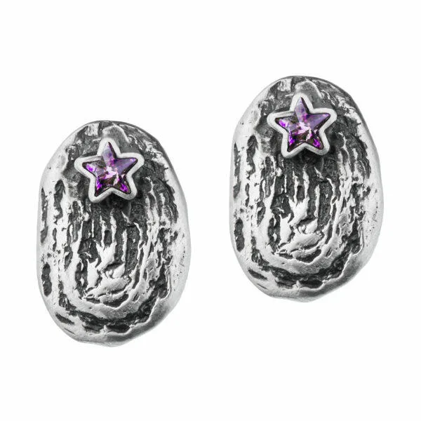 Kolczyki ze srebra oksydowaneg próby 925, wykonane są ręcznie. Wykończenie srebra to antyczne srebro. Blaszka ma wymiary 2,2cm x 1,7cm. Średnica kryształu to gwiazdka w kolorze Vitrail Light 0,5cm. Typ zapięcia to sztyft.