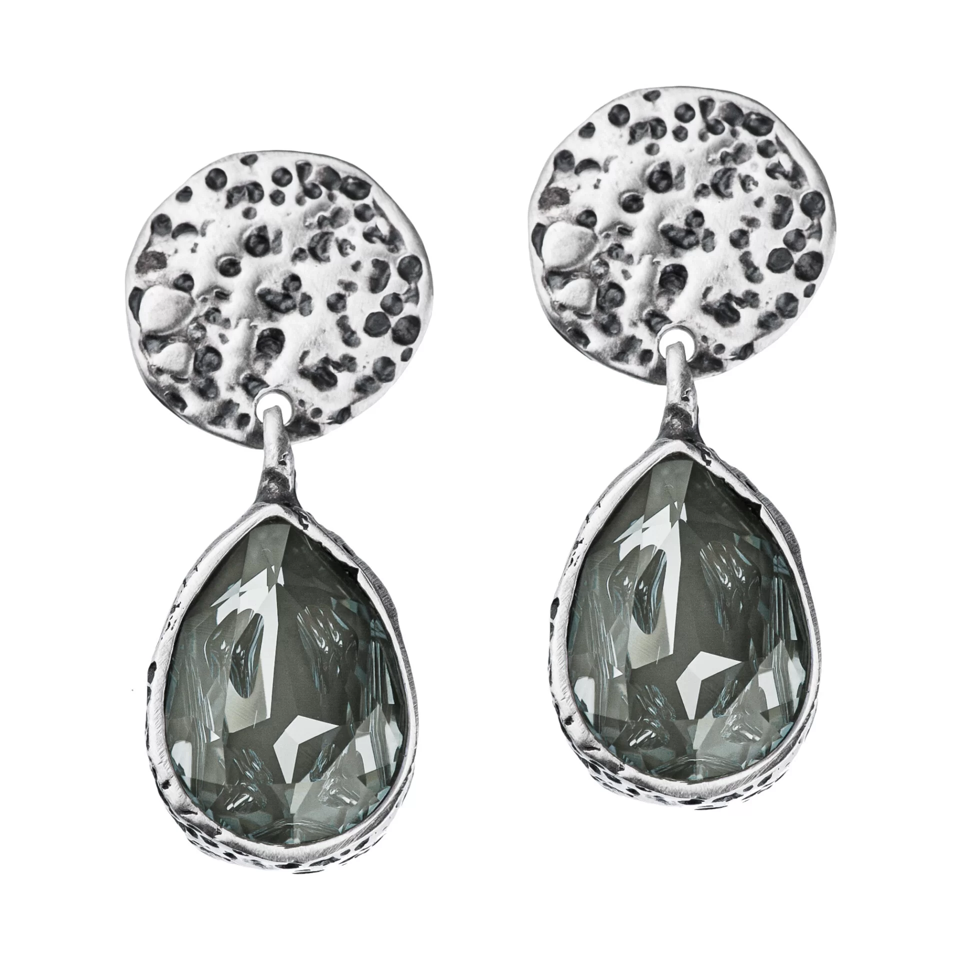 Kolczyki z kolekcji Wyspa Skarbów są wykonane ręcznie ze srebra oksydowanego próby 925. Wykończenie srebra to antyczne srebro. Kamień jest to kryształ w kolorze Dark Grey o wymiarach 2×1,5 cm. Długość całkowita kolczyka wynosi ok. 4 cm. Typ zapięcia to sztyft.