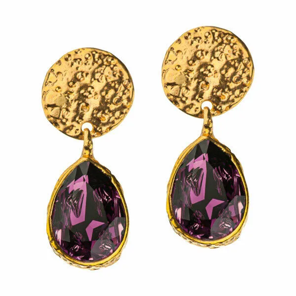 Kolczyki z kolekcji Wyspa Skarbów, ze srebra pozłacanego próby 925, wykonane są ręcznie. Wykończenie srebra to królewskie złoto 24K. Kamień jest to kryształ Swarovskiego w kolorze Amethyst o wymiarach: 2×1,5 cm. Długość całkowita kolczyka wynosi ok. 4 cm. Typ zapięcia to sztyft.