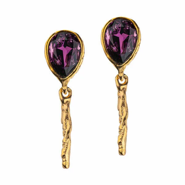 Kolczyki z kolekcji Wyspa Skarbów ze srebra pozłacanego, próby 925 wykonane są ręcznie. Wykończenie srebra to królewskie złoto 24K. Kamień to kryształ w kolorze Amethyst o wymiarach: 1×1,5 cm. Długość całkowita kolczyka wynosi ok. 4 cm. Typ zapięcia to sztyft.