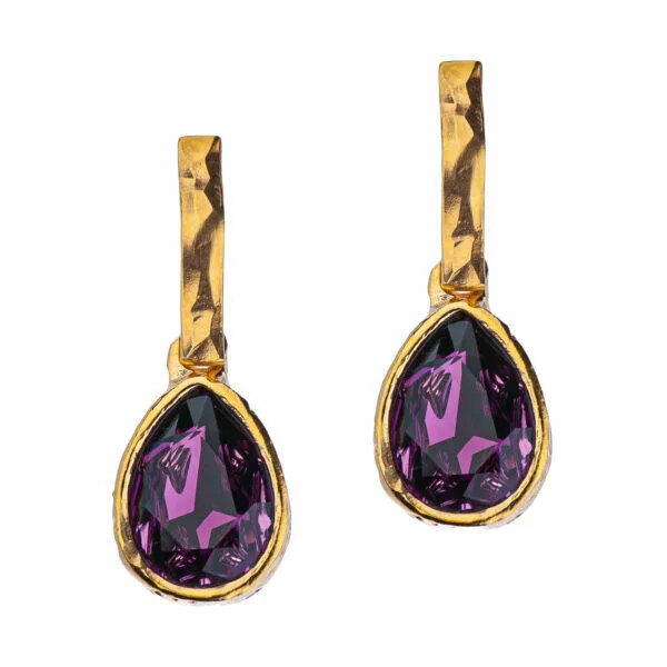 Kolczyki z kolekcji Wyspa Skarbów ze srebra pozłacanego próby 925, wykonane są ręcznie. Wykończenie srebra to królewskie złoto 24K. Kamień to kryształ Swarovskiego w kolorze Amethyst o wymiarach 1×1,5 cm. Długość całkowita kolczyka wynosi ok. 3 cm. Typ zapięcia to bigiel otwarty.