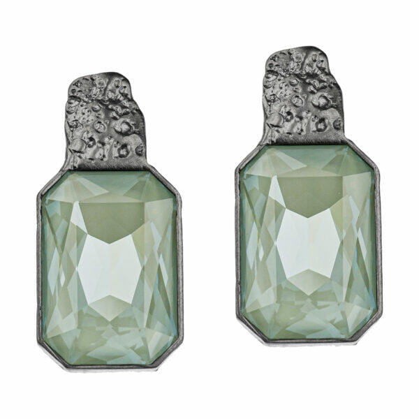 Kolczyki z kolekcji Wyspa Skarbów wykonane są ręcznie ze srebra rodowanego, próby 925. Wykończenie srebra to „24K grafitowy blask”. Kamień jest to kryształ w kolorze Agave o wymiarach 3×2 cm. Długość całkowita kolczyków wynosi ok 4 cm, a typ zapięcia to sztyft.