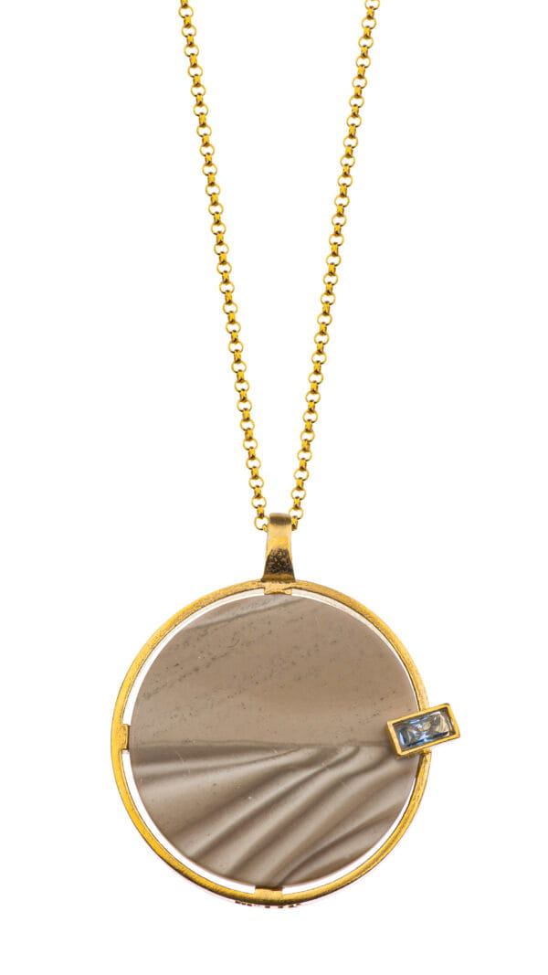 Naszyjnik z kolekcji Diuna wykonany jest ręcznie ze srebra próby 925, natomiast złocenie wykonano „królewskim złotem 24K”. Kamień naturalny to krzemień pasiasty o średnicy 3 cm. Nanokryształ w kolorze Aquamarine o wymiarach 3 x 6 mm. Długość naszyjnika to 80 cm z możliwością regulacji do 57 cm