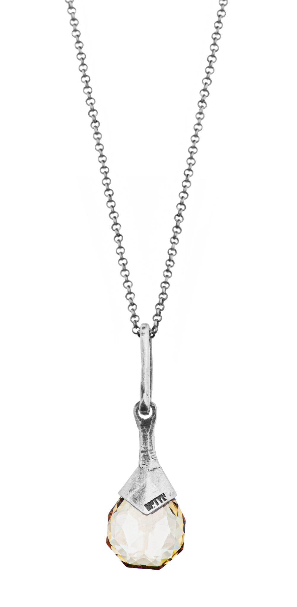 Naszyjnik z kolekcji Diuna wykonany ręcznie ze srebra – oksydowanego próby 925. Wykończenie srebra to „antyczne srebro”. Kryształ o średnicy 1,4 cm. Długość zawieszki to 4,5 cm. Długość naszyjnika to 80 cm z możliwością regulacji do 57 cm.