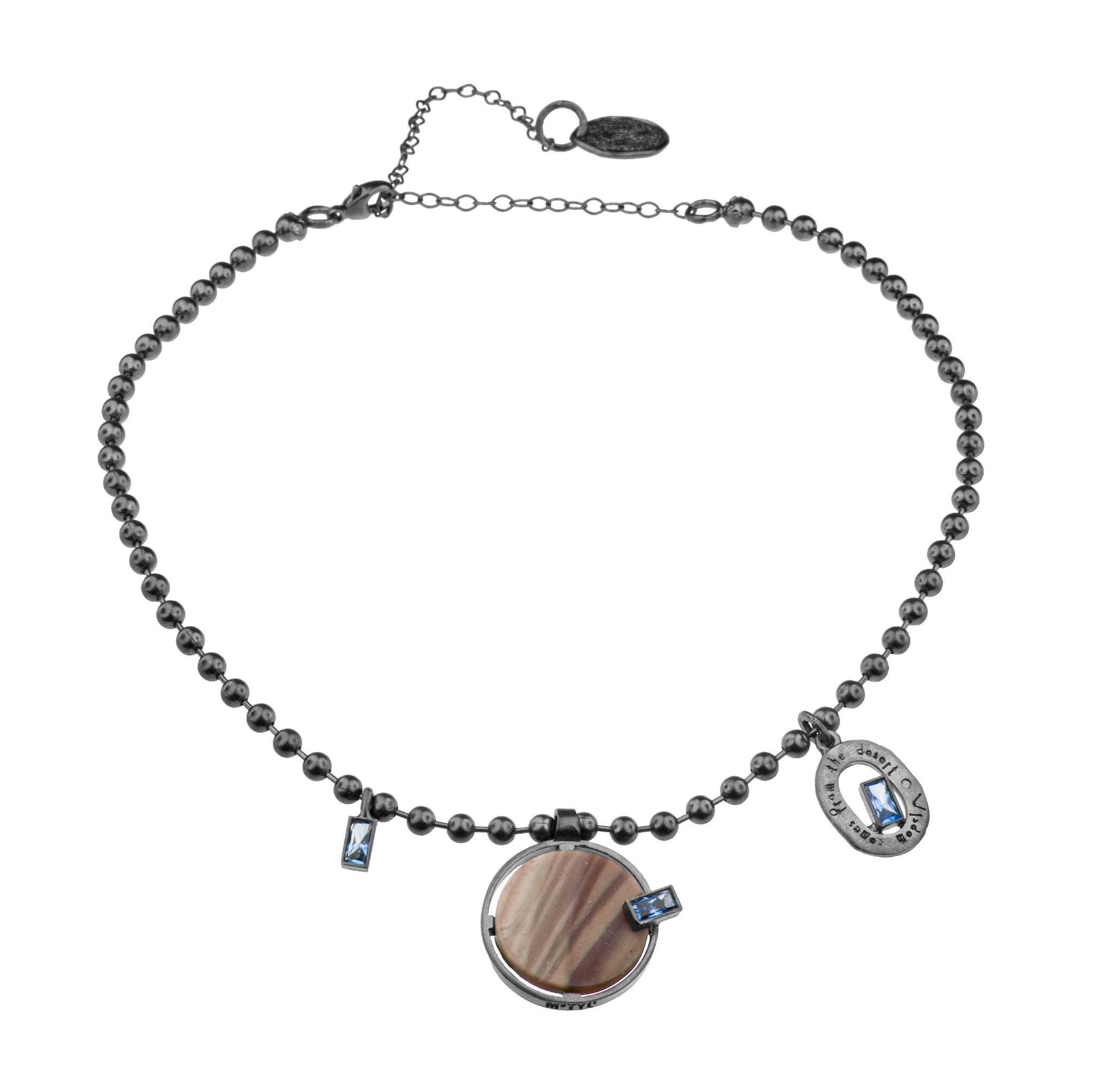 Naszyjnik Diuna wykonany ręcznie ze srebra rodowanego próby 925. Wykończenie srebra to „24K grafitowy blask”. Kamień naturalny to krzemień pasiasty o średnicy 2 cm. Nanokryształy w kolorze Aquamarine o wymiarach 3 x 6 mm. Owalna zawieszka natomiast jest z nanokryształem o wymiarach 1,8 x 1,6 cm. Długość naszyjnika to 50 cm z możliwością regulacji do 36 cm.