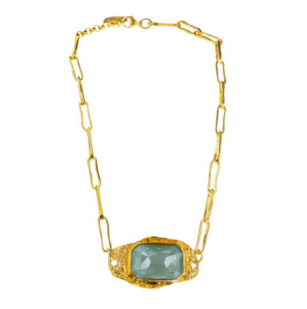 Naszyjnik z kolekcji Wyspa Skarbów jest wykonany ręcznie ze srebra pozłacanego próby 925. Wykończenie srebra to królewskie złoto 24K. Kamień jest to kryształ w kolorze Agave o wymiarach 3×2 cm. Wymiary elementu ozdobnego to ok. 5×3 cm. Długość naszyjnika wynosi 46 cm z możliwością regulacji. Typ zapięcia to karabińczyk.