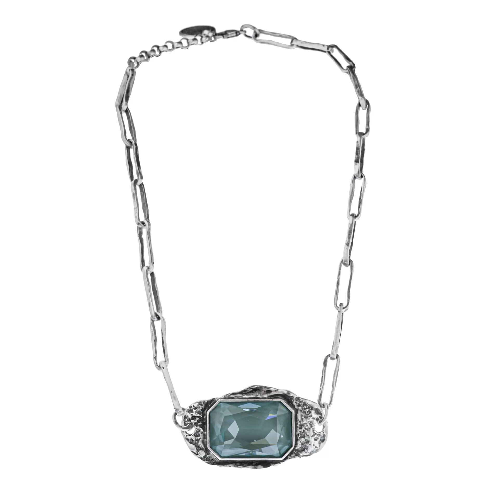Naszyjnik z kolekcji Wyspa Skarbów wykonany ręcznie ze srebra oksydowanego próby 925. Wykończenie srebra to antyczne srebro. Kamień to kryształ w kolorze Agave o wymiarach 3×2 cm, natomiast wymiary elementu ozdobnego to ok. 5×3 cm. Długość naszyjnika wynosi 46 cm z możliwością regulacji. Typ zapięcia to karabińczyk.