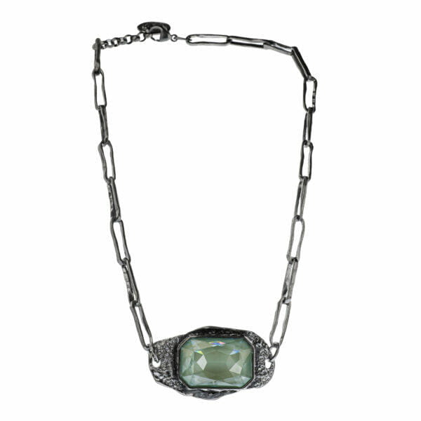 Naszyjnik z kolekcji Wyspa Skarbów wykonany jest ręcznie ze srebra rodowanego, próby 925. Wykończenie srebra to "24K grafitowy blask”. Kamień jest to kryształ Swarovskiego w kolorze Agave o wymiarach 3×2 cm, natomiast wymiary elementu ozdobnego to 5×3 cm. Długość naszyjnika wynosi 46 cm z możliwością regulacji. Typ zapięcia to karabińczyk.